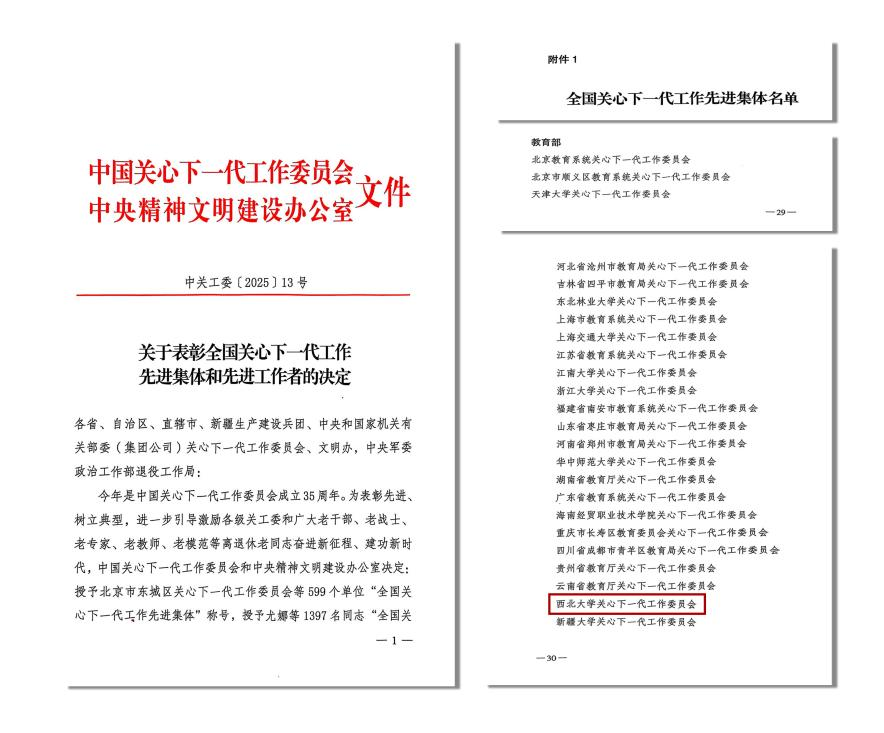 日前,纪念中国关工委成立35周年暨全国关心下一代工作表彰大会在北京召开。会上,中国关工委、中央精神文明建设办公室联合表彰一批全国关心下一代工作先进集体和先进工作者。西北大学关心下一代工作委员会被授予“全国关心下一代工作先进集体”称号。
