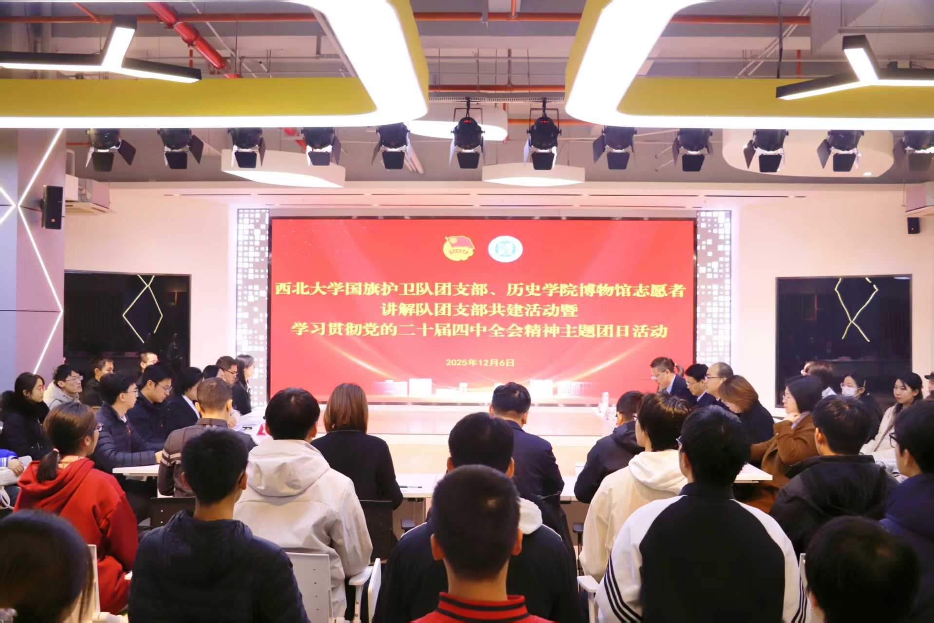12月6日下午,西北大学国旗护卫队团支部与历史学院博物馆志愿者讲解队团支部共建活动暨学习贯彻党的二十届四中全会精神主题团日活动在长安校区举行。团省委书记徐永胜,基层组织建设部部长宋薇娜、一级主任科员任振翔,校党委副书记张远军等出席活动,校团委全体工作人员、历史学院相关负责人及两个支部全体团员青年参加活动。活动由校团委书记刘博主持。