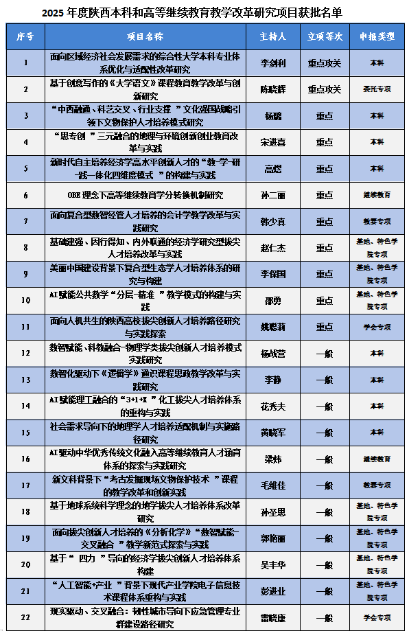 近日,陕西省教育厅公布了2025年度陕西本科和高等继续教育教学改革研究项目立项结果,我校22个项目入选。