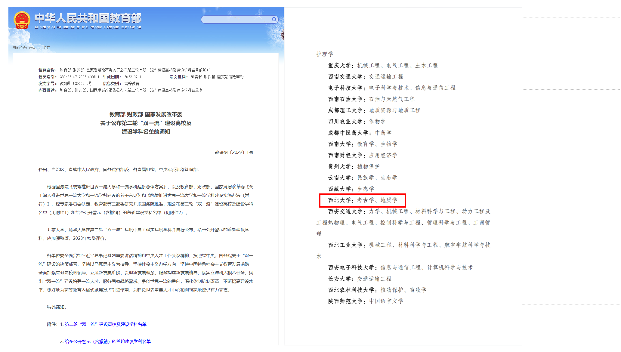 “十四五”以来,学校聚焦“双一流”建设“中国特色、世界一流”核心要求,持续深化综合改革,强化学科内涵建设,取得了明显成效。高质量完成“双一流”建设首轮周期任务,地质学顺利通过评估后再次入选,考古学新增入选建设学科,成为陕西省属高校唯一新增建设学科,入选学科数量位居全国高校第45位,成为第二轮建设中全国36所有新增建设学科的高校之一,为学校奋力走出一条西部地区建设“世界一流大学”的新路子奠定了坚实基础。