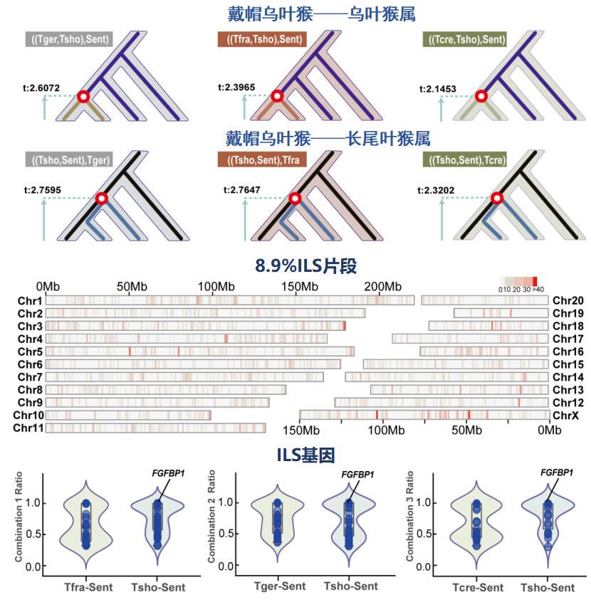 团队验证了杂交、基因交流等多种可能性,均进行了排除。一个更深层的演化机制——“不完全谱系分选”进入视野。为验证这一推断,研究团队进行了分化时间估算。分析发现,那些让戴帽乌叶猴长得更像长尾叶猴的基因序列,其分化时间早于两个物种在进化树上分开的真实时间点,恰好符合“不完全谱系分选”的典型特征。这是由于这些相似特征并非源于物种分化后的独立演化,而是从更古老的共同祖先继承而来。随后,团队基于隐马尔可夫模型的全基因组分析,发现戴帽乌叶猴基因组中约有8.9%的区域仍保留着不完全谱系分选的痕迹。