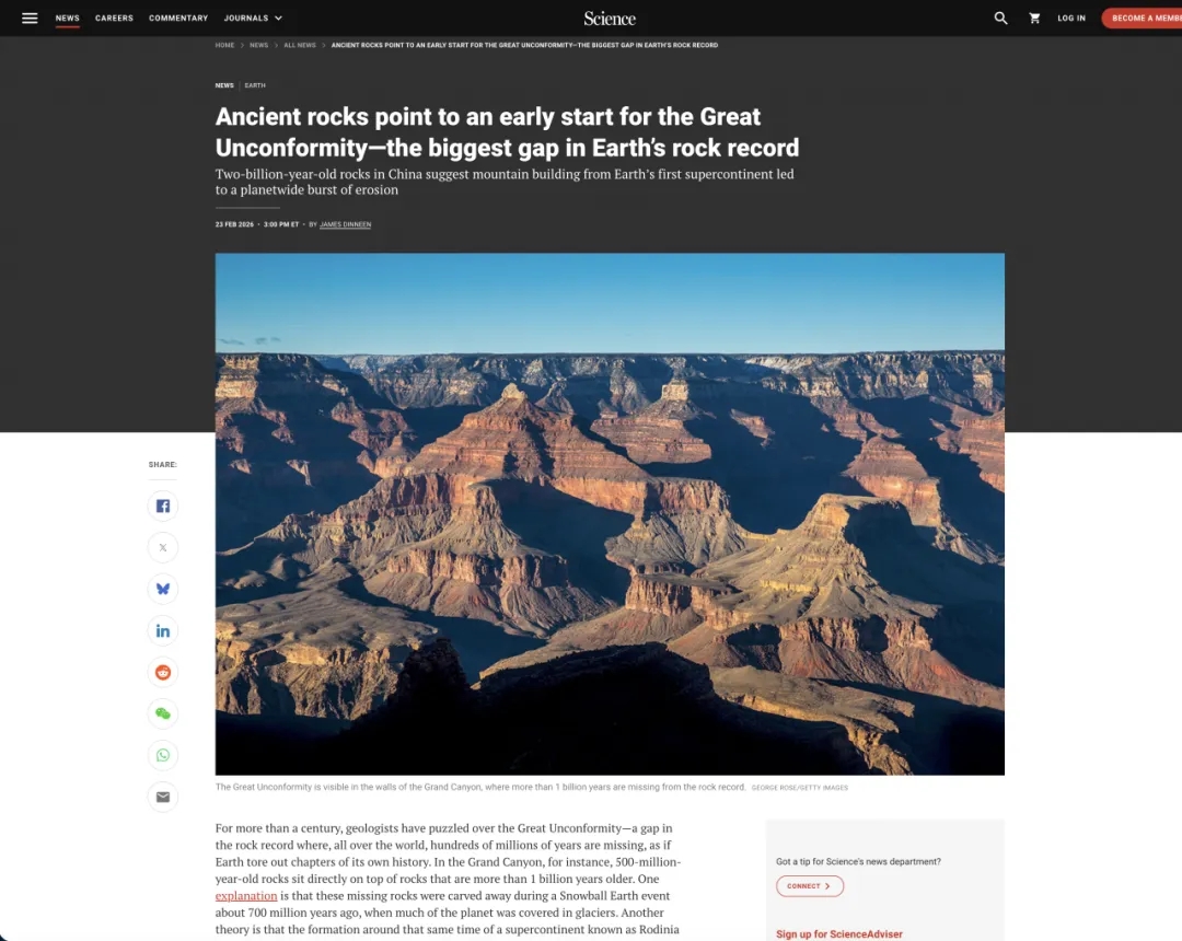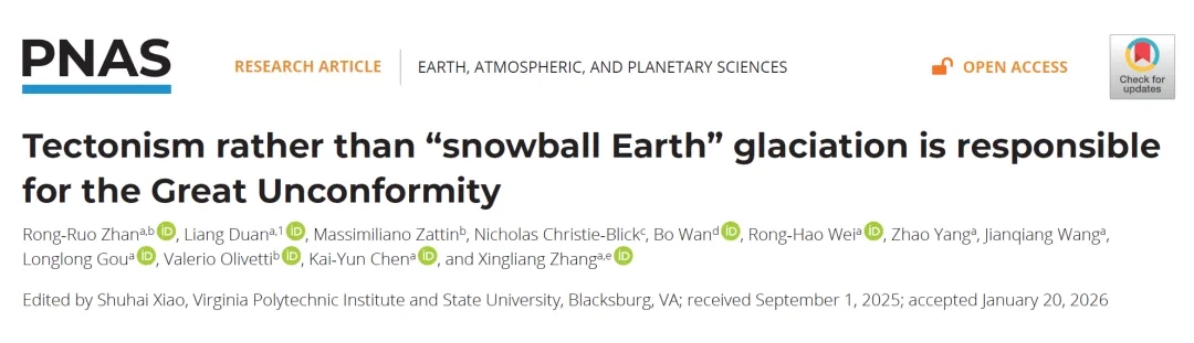 2月23日,我校早期生命与环境研究团队在《美国科学院院刊》(PNAS)上发表了题为“构造运动而非雪球地球时期的冰川作用造成全球大不整合(Tectonism rather than ‘Snowball Earth’ glaciation is responsible for the Great Unconformity)”的媒体关注和亮点文章,以全球视角破解了困扰科学界百年的地质谜题——全球“大不整合”的形成,并非此前认为的“雪球地球”冰川侵蚀。这一突破性发现,为理解地球演化与生命爆发的关联提供了全新视角。
