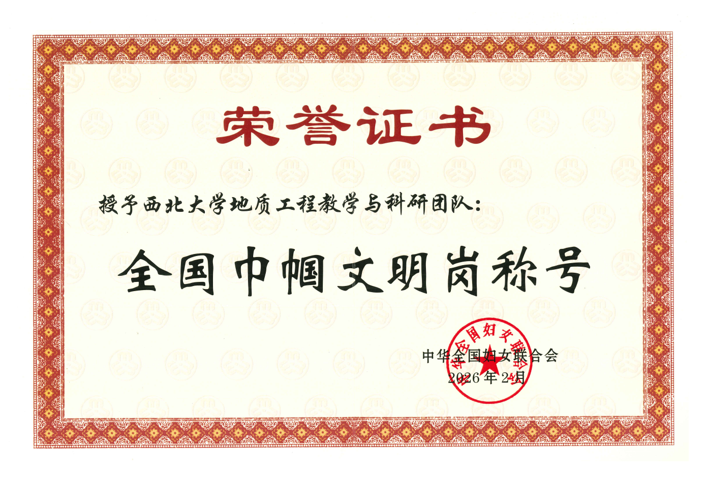 近日,全国妇联在京举行纪念“三八”国际妇女节暨表彰大会,对全国三八红旗手标兵、全国三八红旗手、全国三八红旗集体和全国巾帼文明岗进行表彰。我校地质工程教学与科研团队荣获全国巾帼文明岗,并在3月6日举办的陕西省纪念“三八”国际妇女节116周年暨表彰大会上领奖。