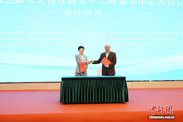 中新网西安9月17日电 记者17日从丝绸之路考古合作研究中心获悉,西北大学与哈密市人民政府校地全面合作协议签订暨丝绸之路考古合作研究中心哈密分中心揭牌仪式15日在新疆维吾尔自治区哈密市举行。