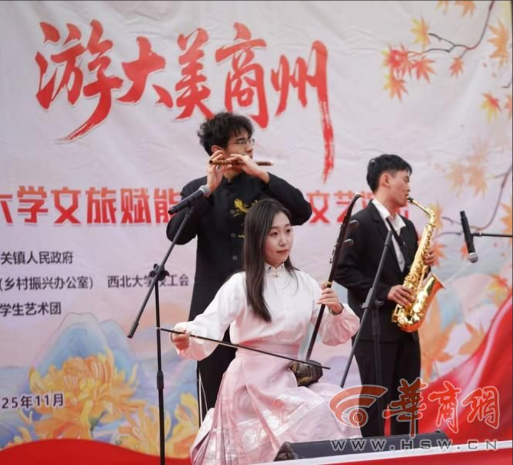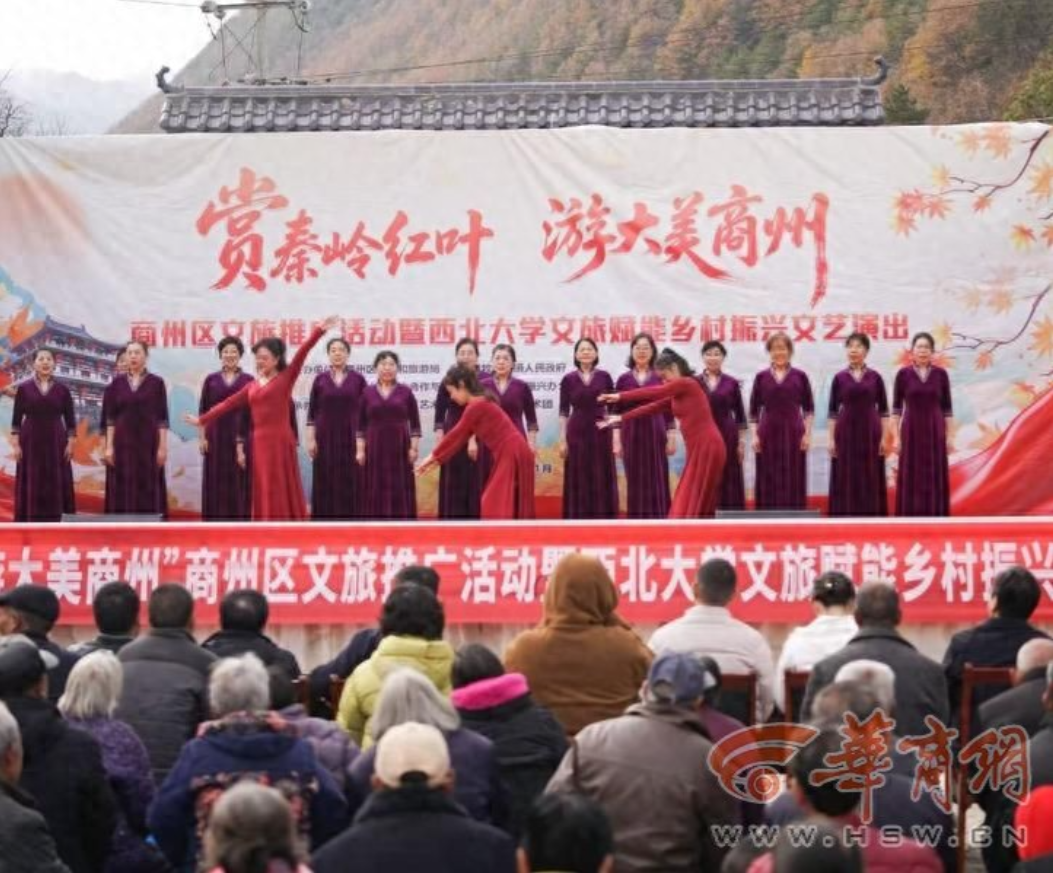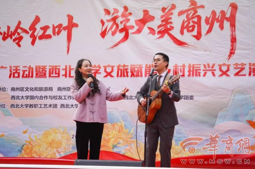 11月8日,“赏秦岭红叶、游大美商州”商州区文旅推广活动暨西北大学文旅赋能乡村振兴文艺演出活动在陕西省商洛市商州区牧护关镇铁炉子村党群服务中心隆重举行。商州区政府党组成员曾佳、商州区文化和旅游局副局长李彦、商州区牧护关镇党委书记闵健、西北大学国内合作与校友工作处(乡村振兴工作办公室)副处长燕来出席活动,商州区牧护关镇、西北大学工会、西北大学团委相关工作负责人,以及铁炉子村“两委”干部、镇包村干部、西北大学驻村工作队全体成员、铁炉子村村民和游客等500 余人观看演出。演出节目由西北大学工会教职工艺术团、西北大学团委学生艺术团精心编排。