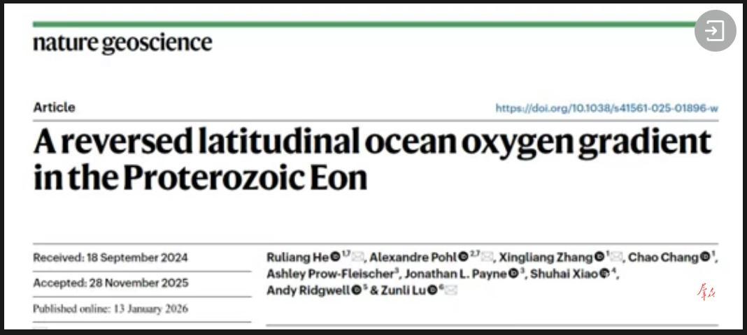 此次研究显示,在20亿年前到5.4亿年前这一时间段,海洋的氧气含量由赤道附近向中高纬度降低,氧气分布受产氧光合作用主导,是“氧气绿洲”式氧化模型;而到了显生宙(5.4亿年前至今),海洋的氧气含量由赤道附近向中高纬度增加,氧气分布受海水温度与有机质氧化分解作用主导,是类似现代的纬度控制式氧化模型。海洋氧化模型的转换发生于元古宙(25亿年前至5.4亿年前)与显生宙之交,与该时期的大气氧化过程相关。