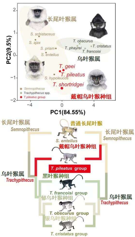戴帽乌叶猴种组与长尾叶猴种组等形态特征、系统发育对比。西北大学/供图